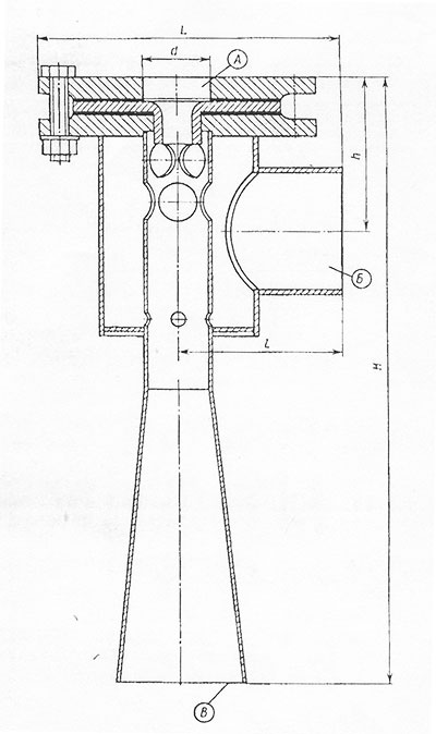 Эжекторы обозначаются ЭВ (эжектор водоструйный). Цифра в марке эжектора обозначает расход рабочей воды. Чертежи общих видов эжекторов даны на рис. 6 и 7.