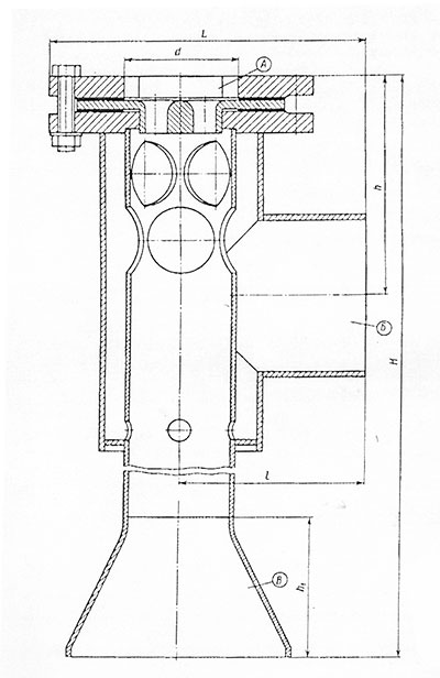 | Давление парогазовой смеси на выходе, МПа Массовый расход: неконденсирующихся газов, кг/ч рабочей воды, т/ч Температура рабочей воды на входе, °С Давление пробное при гидроиспытании, МПа Рекомендуемая высота установки эжектора (от уровня воды в баке-газоотделителе до оси патрубка парогазовой смеси),м Давление рабочей воды (перед соплом), МПа абс Масса, кг |