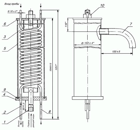 1 — патрубок; 2 — змеевик; 3 — труба-ограничитель; 4 — донышко; 5 — труба; 6 — крышка; 7 — патрубок; 8 — змеевик; 9 — кольцо резиновое; 10 — гайка;