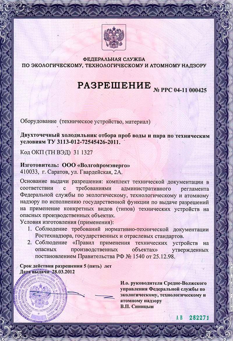 Холодильники отбора проб сертифицированы на соответствие ГОСТ Р и так как поставлялись на опасные производственные объекты имеют Разрешения на применение, выданные Ростехнадзором РФ.