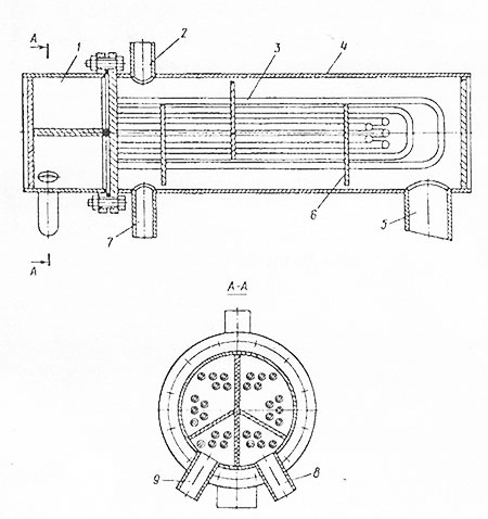 1 — водяная камера; 2 — отвод парогазовой смеси к эжектору; 3 — трубная система; 4 — корпус; 5 — подвод выпара; 6 — промежуточная перегородка; 7 — отвод конденсата; 8 — подвод охлаждающей воды; 9 — отвод охлаждающей воды.