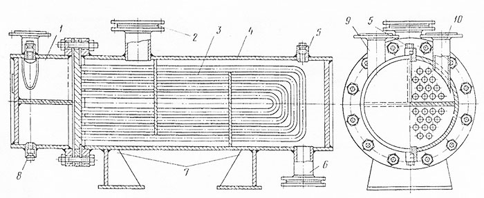 1 — водяная камера; 2 — подвод выпара; 3 — трубная система; 4 — корпус; 5 — отвод парогазовой смеси; 6 — слив конденсата; 7 — опоры; 8 — дренаж; 9 — отвод охлаждающей воды; 10 — подвод охлаждающей воды.