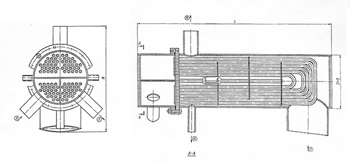 На рис.1 и 2 представлены принципиальные схемы горизонтальных поверхностных охладителей выпара соответственно для деаэраторов типа ДВ и ДА. Охладители состоят из горизонтального корпуса, в котором размещена трубная система. Внутри трубок движется химически очищенная вода, которая затем направляется в деаэратор. В охладителях выпара вакуумных деаэраторов (см. рис. 1) корпус приваривается к трубной доске во избежание присосов воздуха. Конденсат выпара возвращается в колонку (на верхнюю тарелку) деаэратора или сливается в дренажные баки в зависимости от компоновки деаэрационной установки.