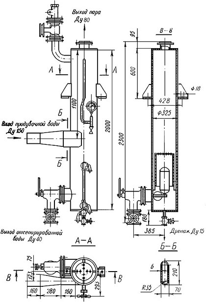 Сепараторы с рабочим давлением 0,061 МПа (0,6 кгс/см²) предназначены для установки в схемах, в которых отсутствуют отключающая арматура на паропроводе между сепаратором и деаэратором.